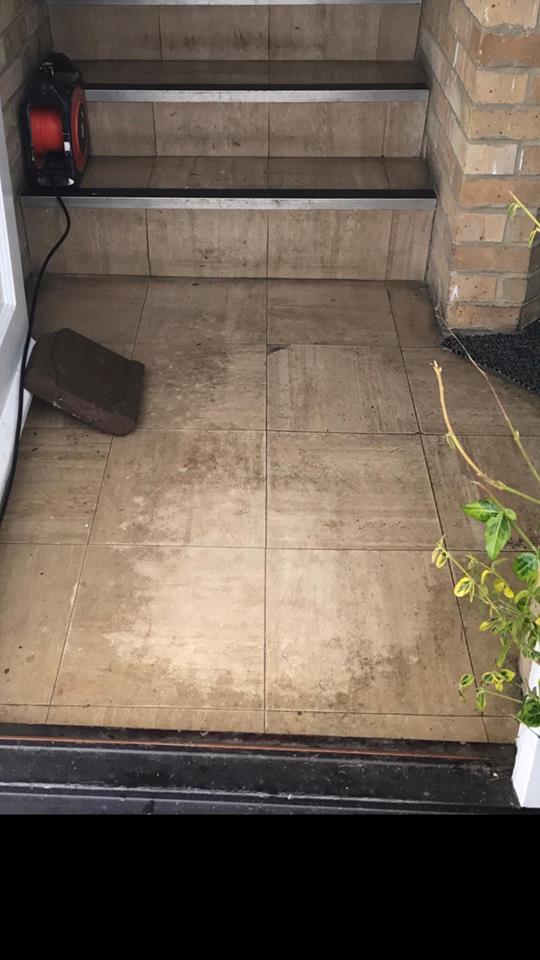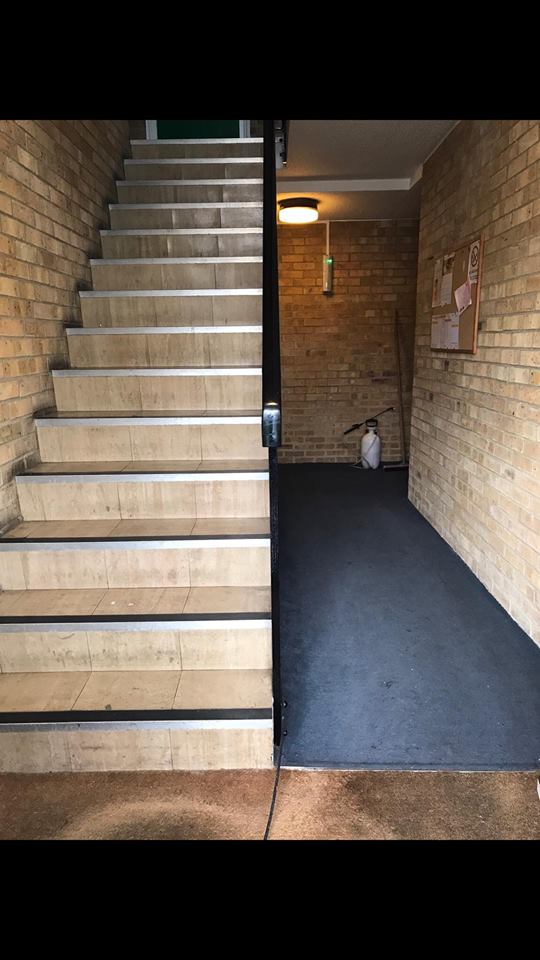 The stairwells and tiled areas were swept through initially prior to treating them with a special solution which removes rubber marks (from shoes), oil, grease, soot and heavy soiling not only from tiles but carpets to, diluting the solution accordingly to the surface we’re treating and the amount of dirt. Once the solution is applied we use a battery operated “Turbo Brush” to agitate and scrub the tiles breaking down the soil ready for extraction, to do this we use the wand on the carpet cleaning machine. The dirty water is lifted from the tiles into the dirty tank, the tiles are then buffed using a soft head on the Turbo Brush with a combination of dry cloths and towels. Residents in the blocks were amazed at the results and commented on how good the communal areas looked.