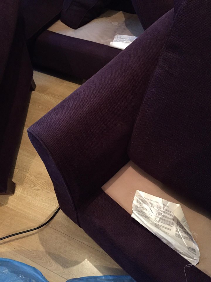 The suite was finally flushed through using a fibre and fabric rinse, this restores the PH level to neutral and helps bring back the original colour of the suite. It was a dark burgundy suite and the colour really began to come through after this process. Air movers are used during the cleaning process to enhance the drying time of the suite. Due to the amount of water used we wanted to avoid shrinkage, therefore with jobs such as this its important to extract as much moisture and dry off as quickly as possible.