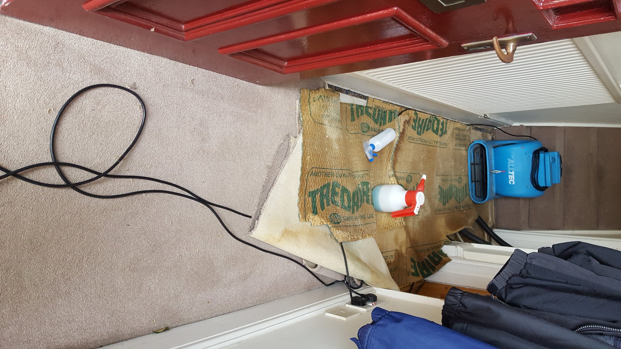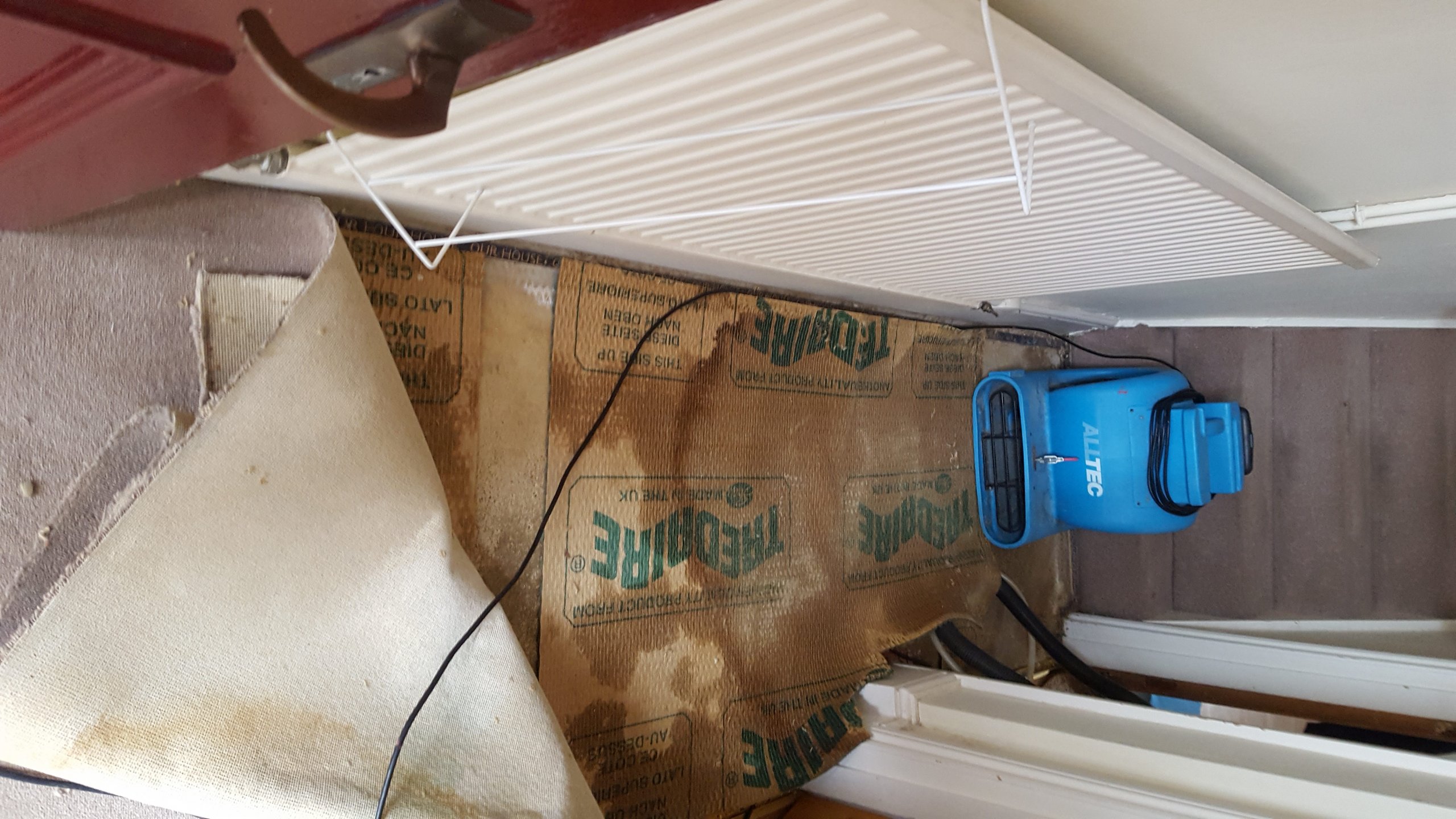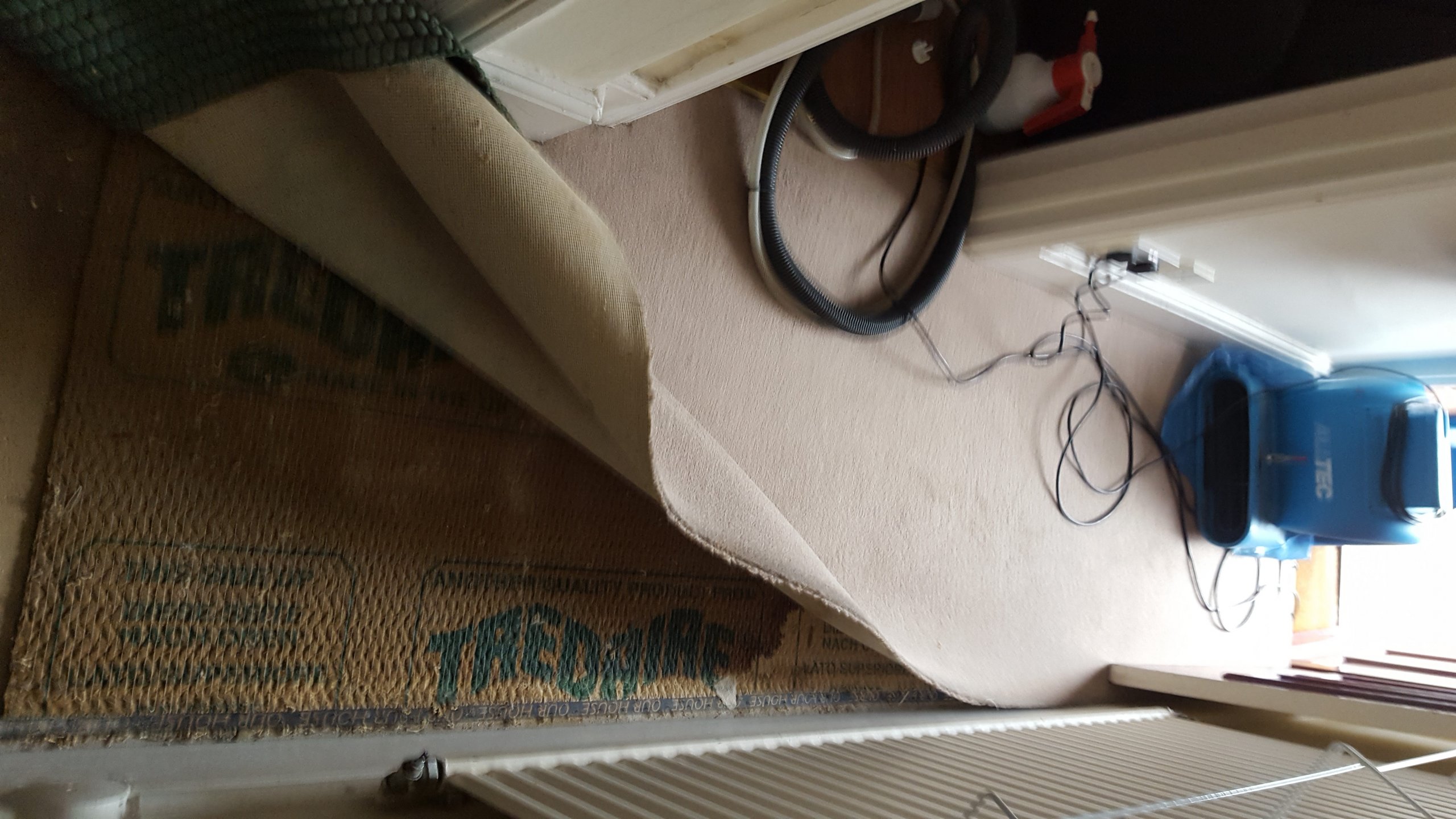 When we arrived I had to extract any surface water using our hot water extraction system, I then gave the carpet a light spray with an odour kill treatment. The carpets were lifted in the hall way to find that water had penetrated through to the underlay and sub floor, this to had to be lifted and any excess water extracted.  Once this was done the sub floor was treated with an envirosafe treatment which would eradicate bacteria and mould growth and was allowed to work whilst we extracted water from the back of the carpet and both sides of the underlay. Air movers were positioned to blow under the carpet and underlay to enhance the drying out process, it’s important to dry out the carpets at the earliest opportunity. Once the carpets and underlay were dry we treated both sides with an odour kill treatment, the underlay and carpet were then fitted into their original position.
